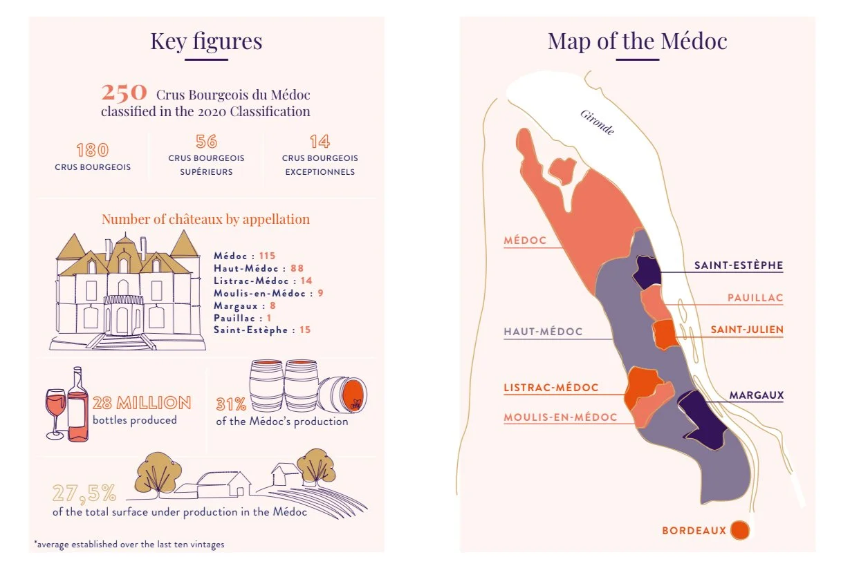 Today, the Cru Bourgeois classification is overseen by L’Alliance des Crus Bourgeois du Médoc, a group of about 170 châteaux spanning eight Médoc appellations: Médoc, Haut-Médoc, Listrac-Médoc, Moulis-en-Médoc, Margaux, Pauillac, Saint-Julien, and Saint-Estèphe.