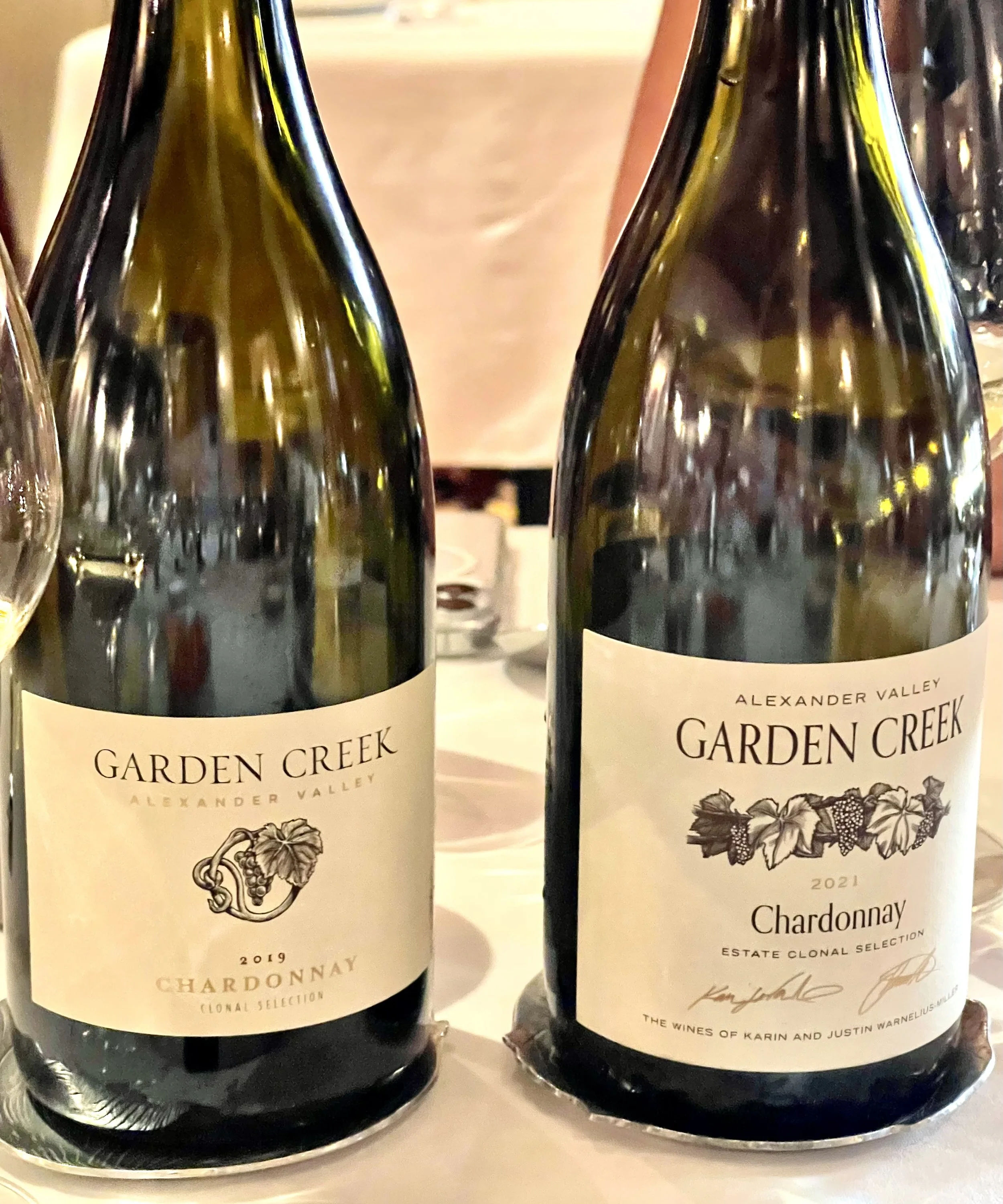 That complexity finds its way into the wines. At lunch, we tasted two Garden Creek Alexander Valley Chardonnays: 2019 and 2021. The 2019 is fuller-bodied and creamy textured, with fragrant citrus blossom, honeysuckle, peach, and Meyer lemon notes, and a long, savory finish. The 2021 is leaner with racy acidity and a multitude of fresh fruit flavors: white peach, nectarine, lemon, and apricot.