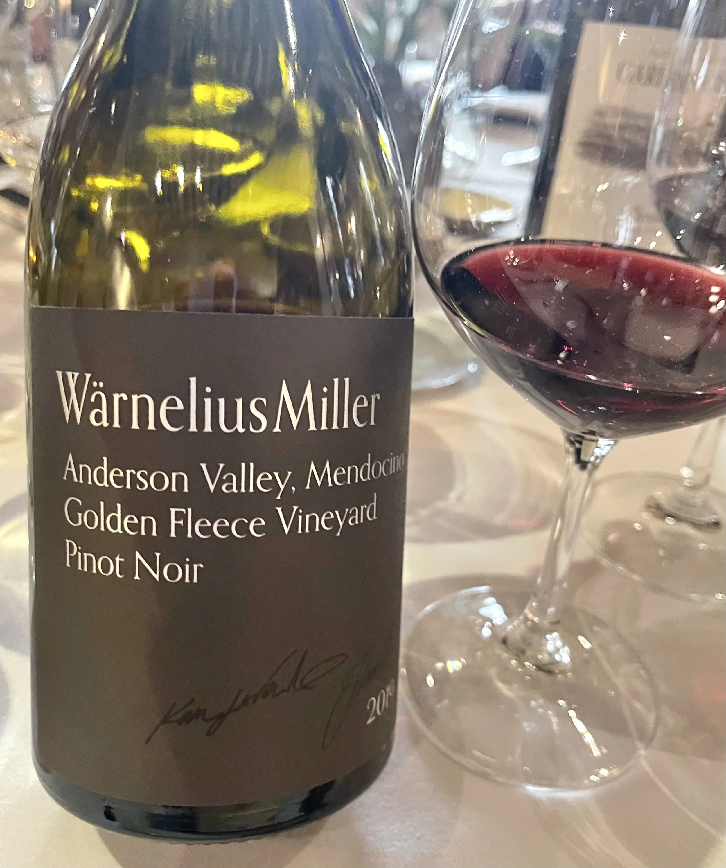 At lunch, the 2019 WärneliusMiller Pinot Noir was just as Justin had promised: far from delicate, with plenty of personality: black cherries and plums on the fragrant nose, with earthy notes keeping it grounded. The silky texture made it an easy match with both steak and sea bass, showing depth without ever taking over the dish.