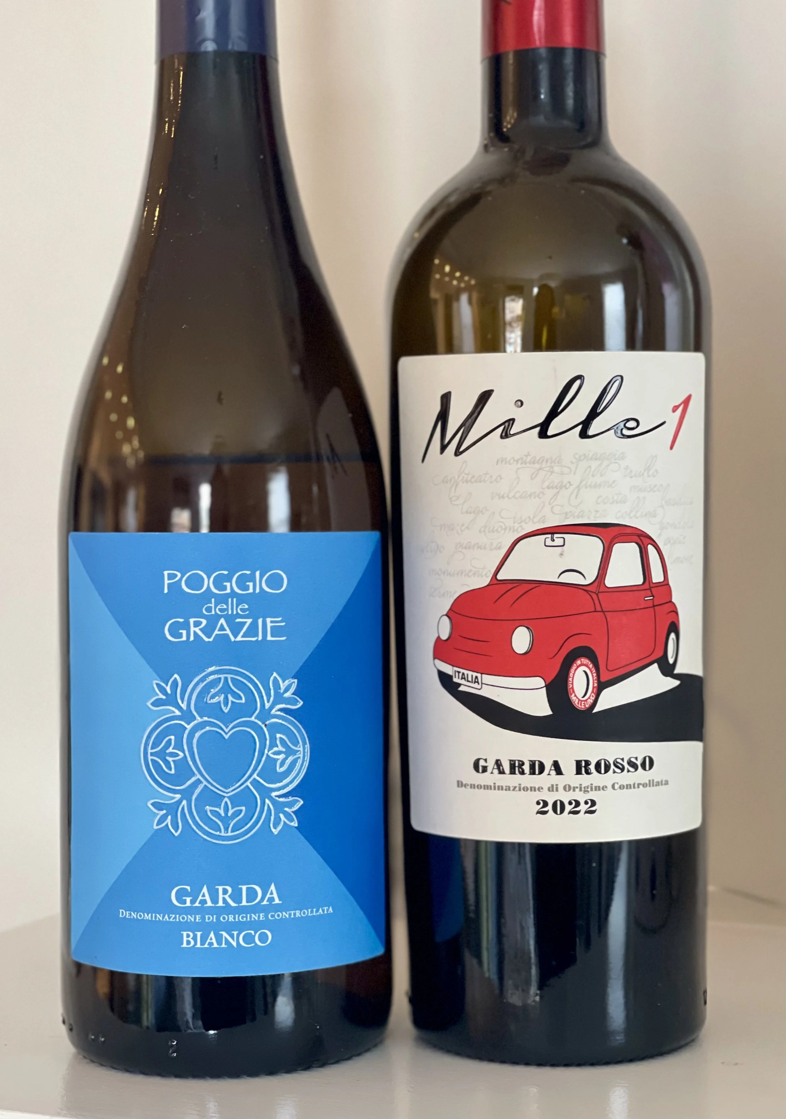 At left, Poggio delle Grazie Garda Bianco 2024, made from a 60/40 blend of Friulano and Trebbiano. A crisp, citrusy white wine with low, 11.5% alcohol. At right, Pratello Mille 1 Garda Rosso 2022, made with 40% Rebo, 40% Merlot, and 20% Corvina. Medium+ body, fruity (cherry, strawberry) with a savory finish (herbs and tobacco). Photo: Lisa Denning